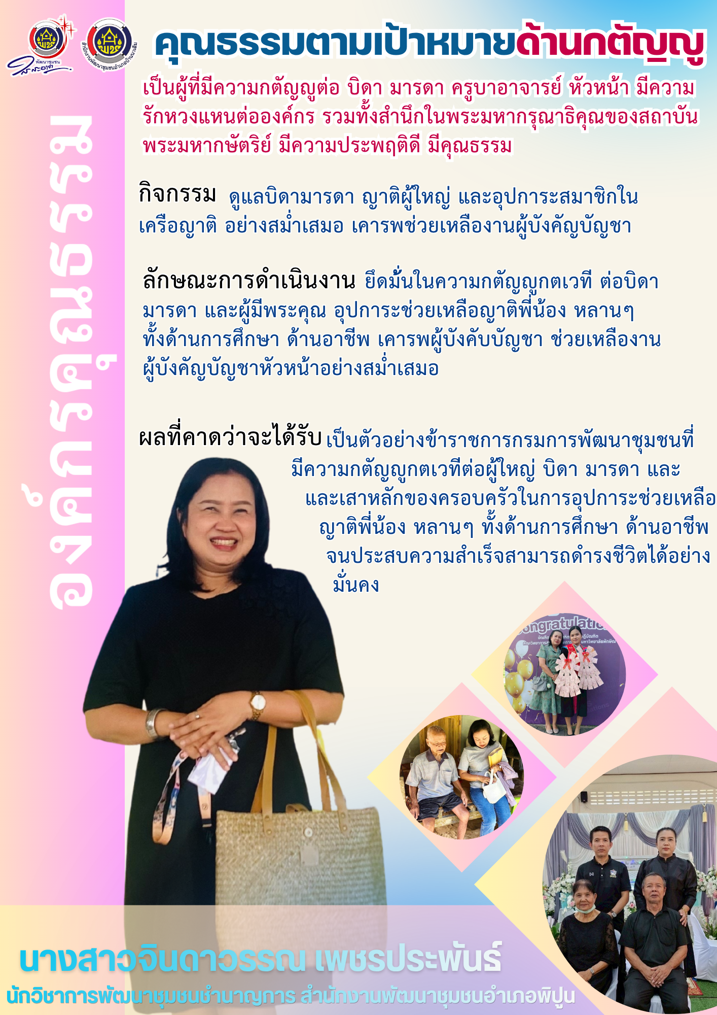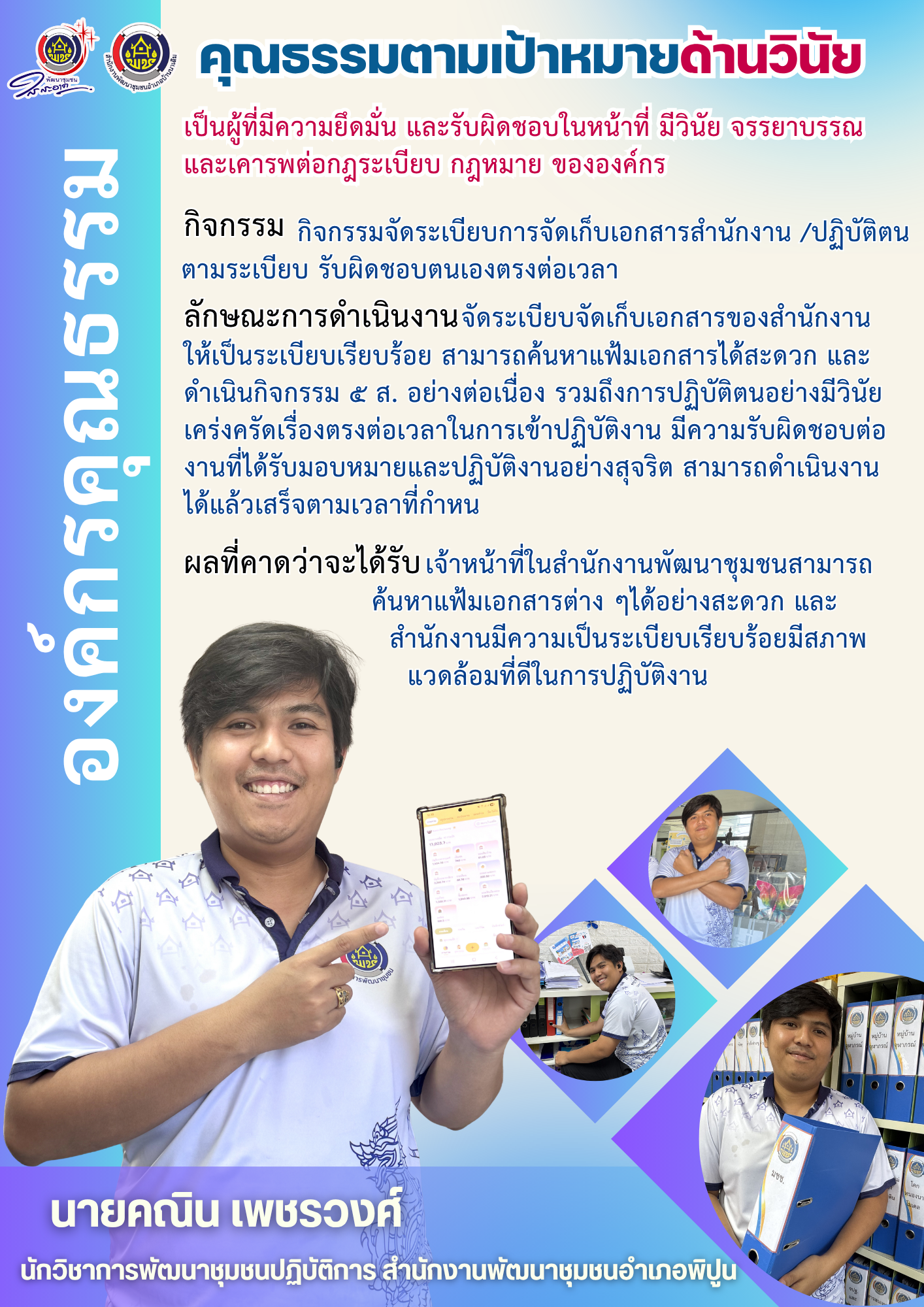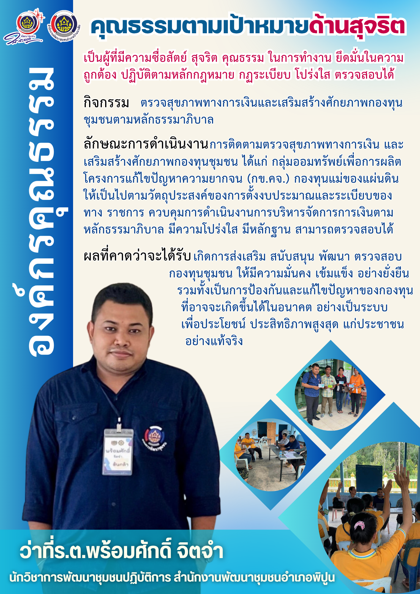 สำนักงานพัฒนาชุมชนอำเภอพิปูนขับเคลื่อนองค์กรคุณธรรมตามนโยบายคณะกรรมการส่งเสริมคุณธรรมแห่งชาติ โดยยึดหลักคุณธรรม 4 ประการ (พอเพียง, วินัย, สุจริต, จิตอาสา) มาเป็นฐานในการทำงานและดำรงชีวิต เพื่อสร้างคนดี คนเก่ง มีคุณธรรม ส่งเสริมหลักธรรมาภิบาล และพัฒนาชุมชนสู่สังคมคุณธรรมอย่างยั่งยืน